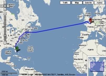 If you ever decide to travel to Paris, don’t buy an airplane ticket! According to Google Maps, it’s easy and cheap too. Look for driving directions from Miami to Paris, France and they'll give them to you, including this step, "Swim across the Atlantic Ocean 3,462 miles". They even advice you to swim across Atlantic Ocean and then drive around France to get to Paris. It will only take you 5,078 mi (about 30 days 2 hours)… piece of cake!